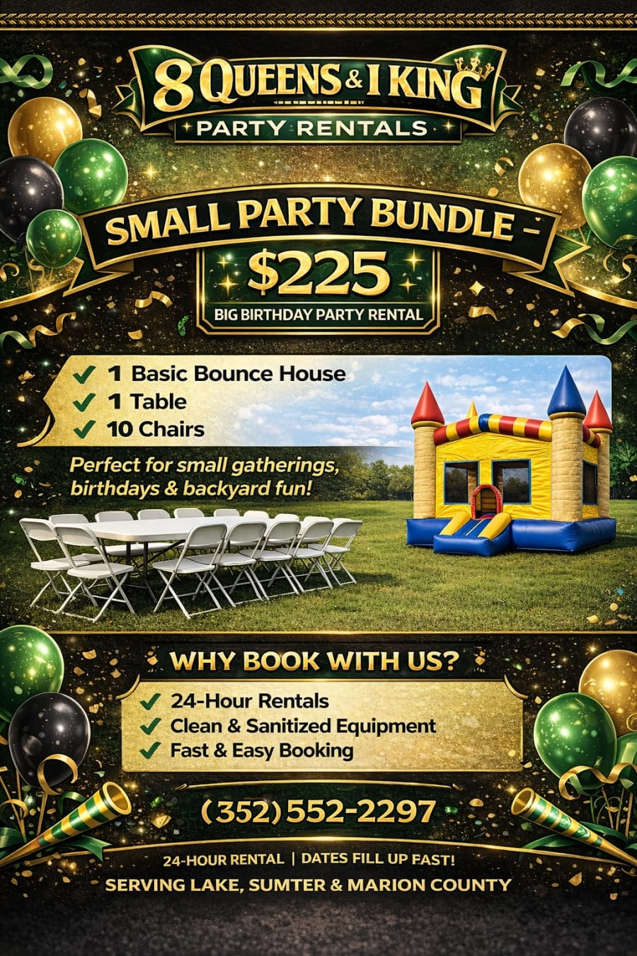 Ready to host? Reserve the rental Small Party Package in marion county, lake county, sumter county and all other counties today and create memorable, stress-free moments for your guests. π